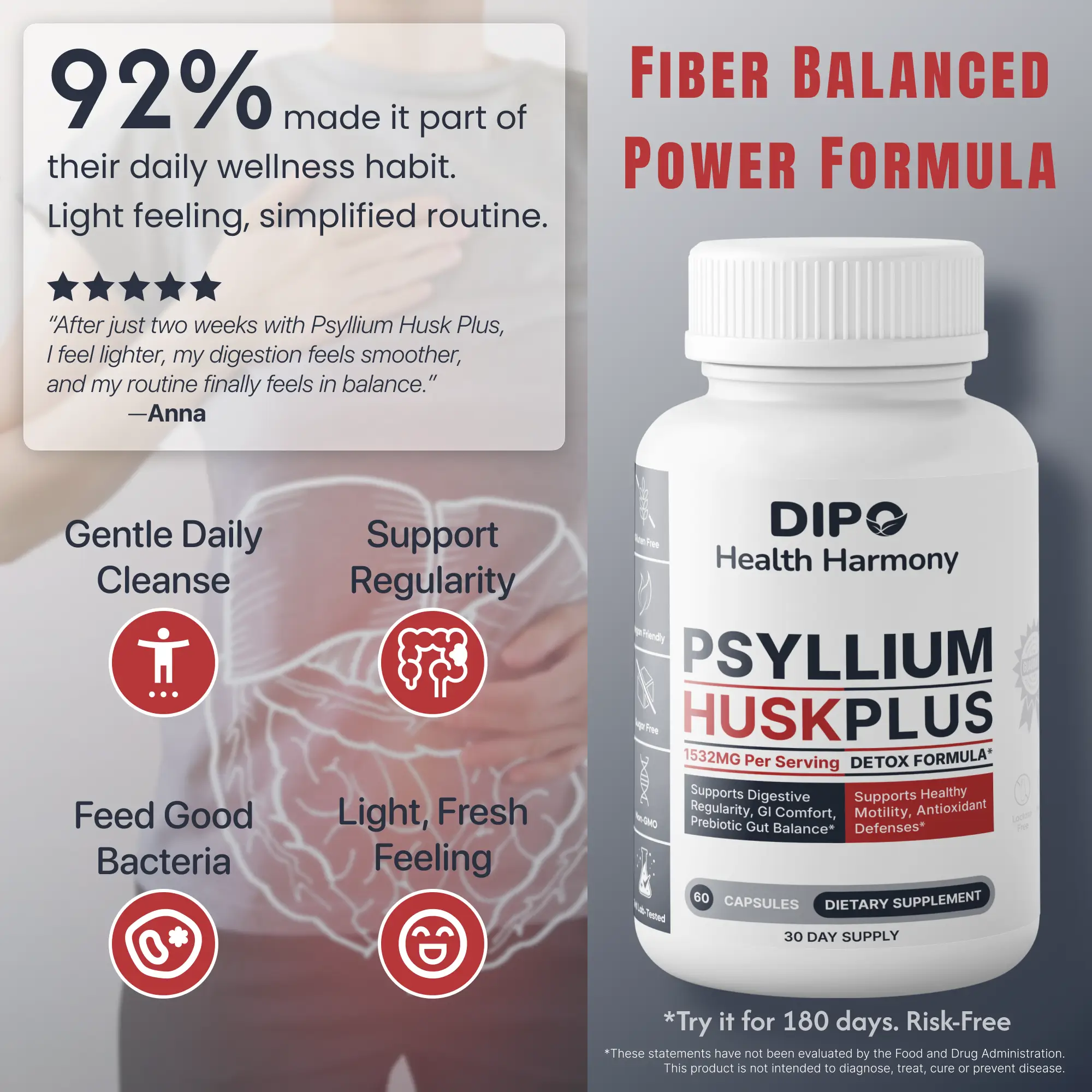 This formula combines soluble fiber, soothing botanicals, prebiotics, and phytonutrients that work in harmony.