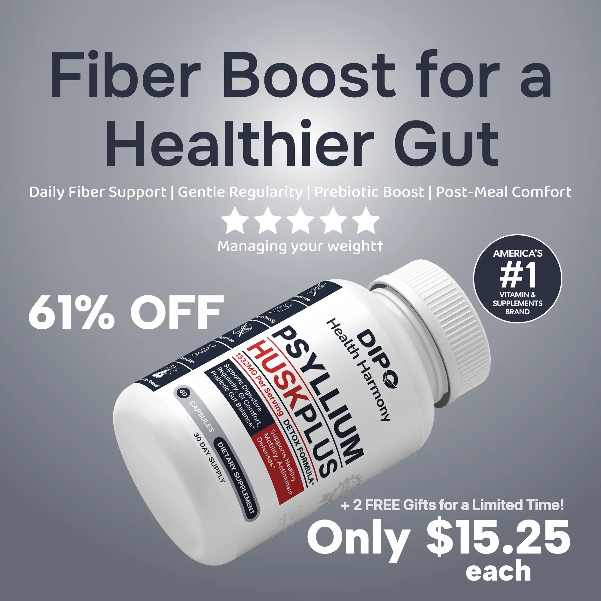 This formula combines daily fiber (psyllium husk) with soothing botanicals, gentle prebiotics, and phytonutrient-rich plant extracts. Together, they support bowel regularity, digestive comfort, a balanced gut environment, and overall wellness after meals.