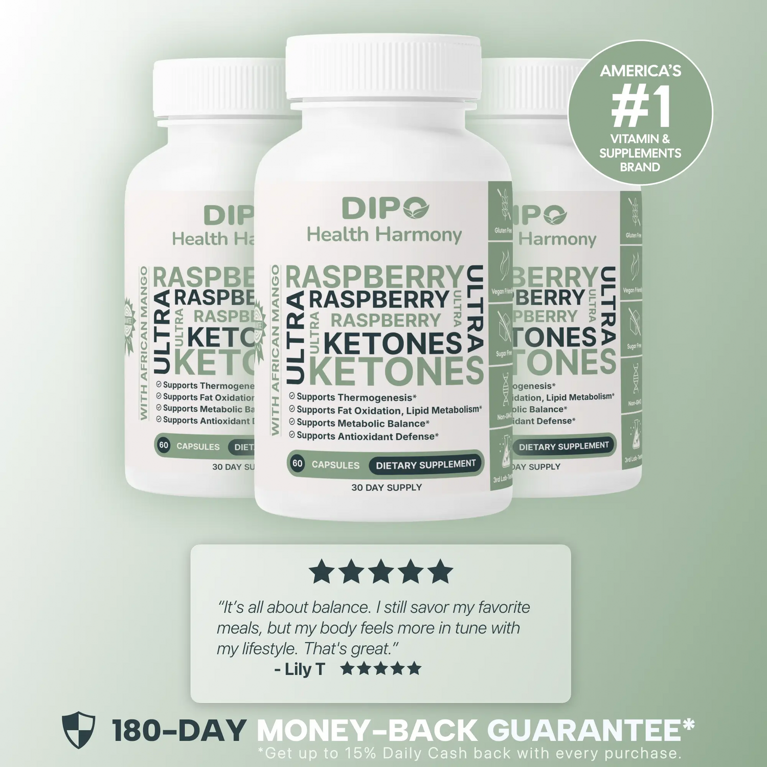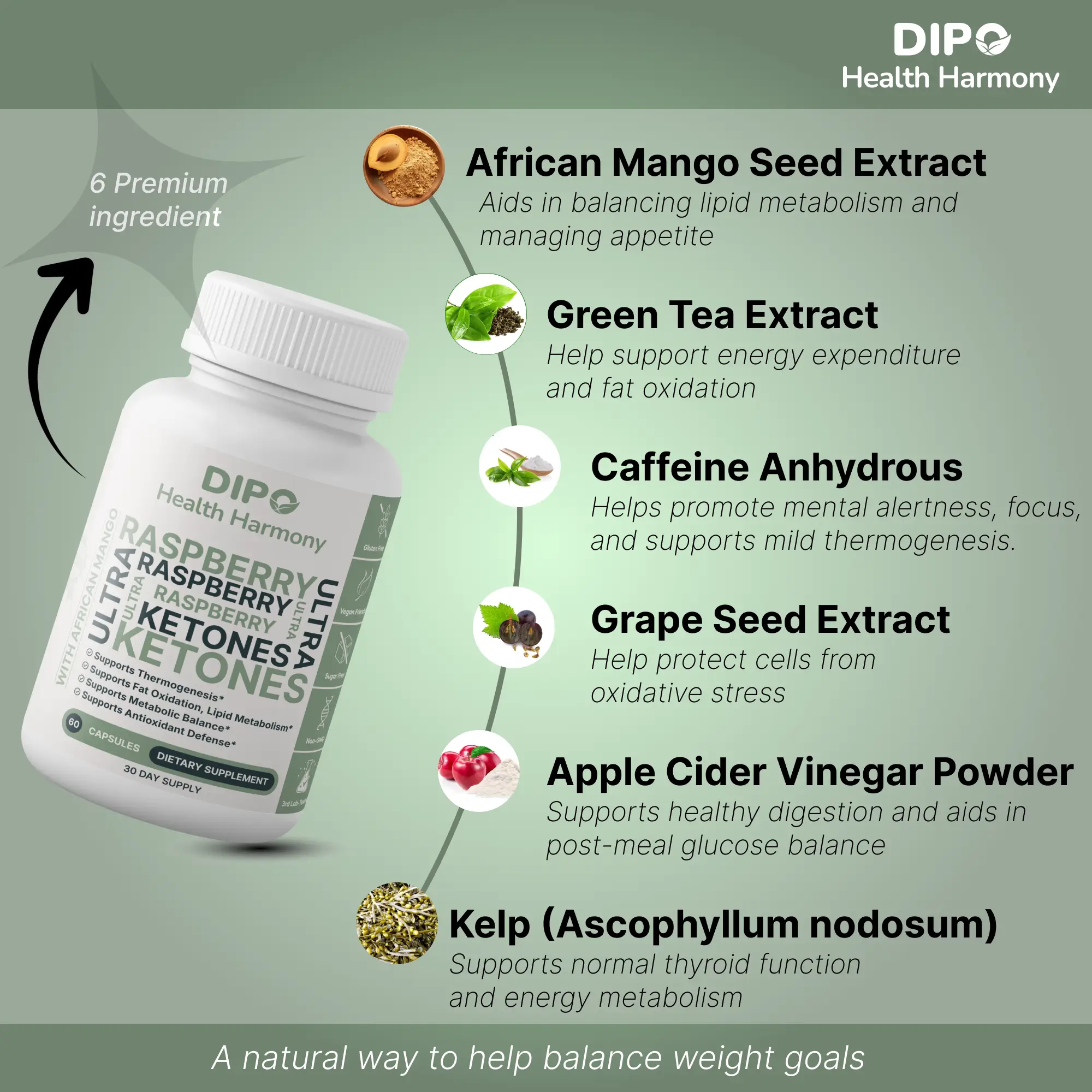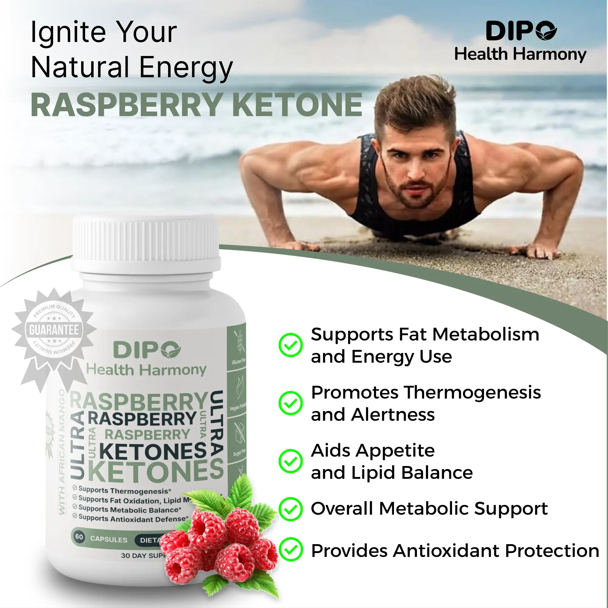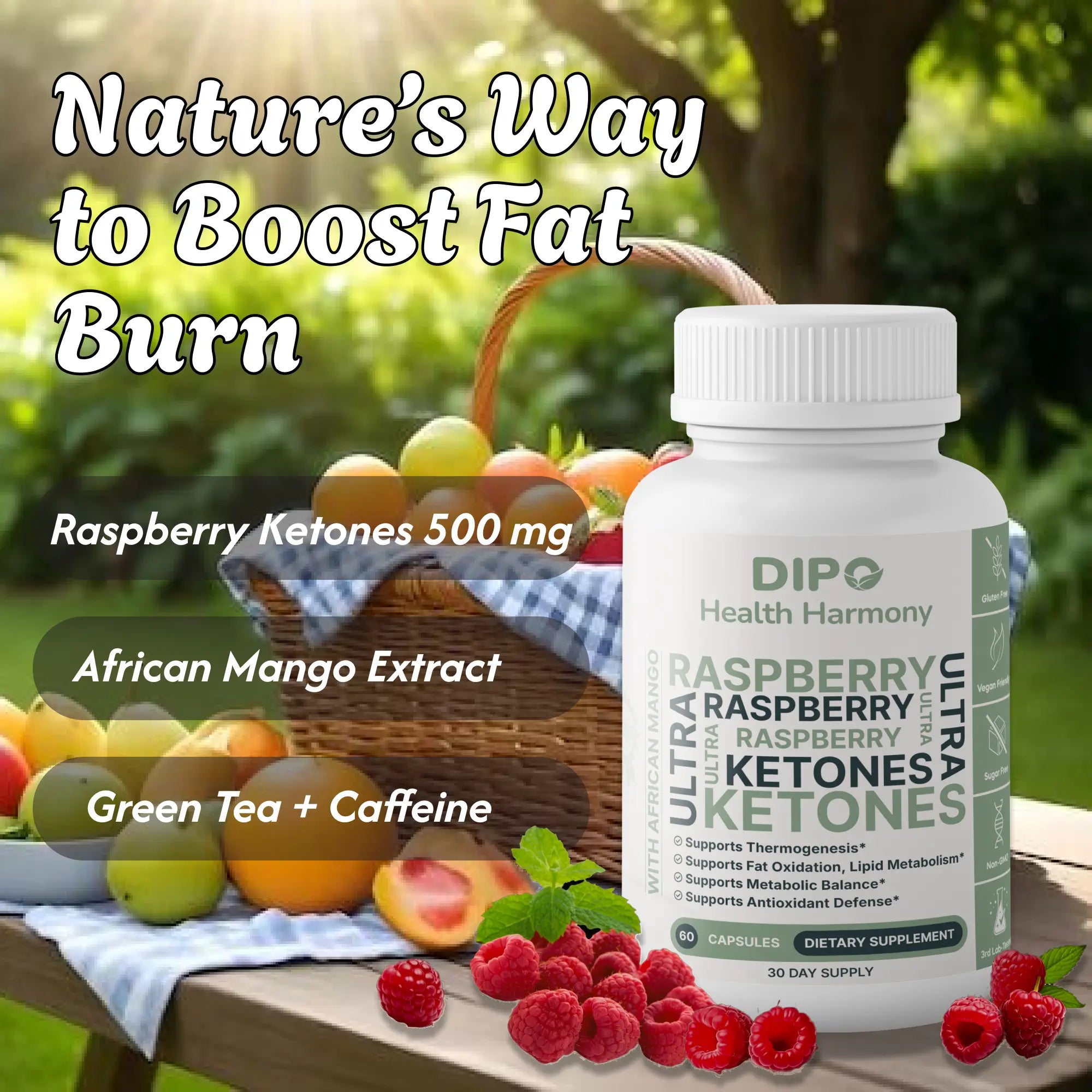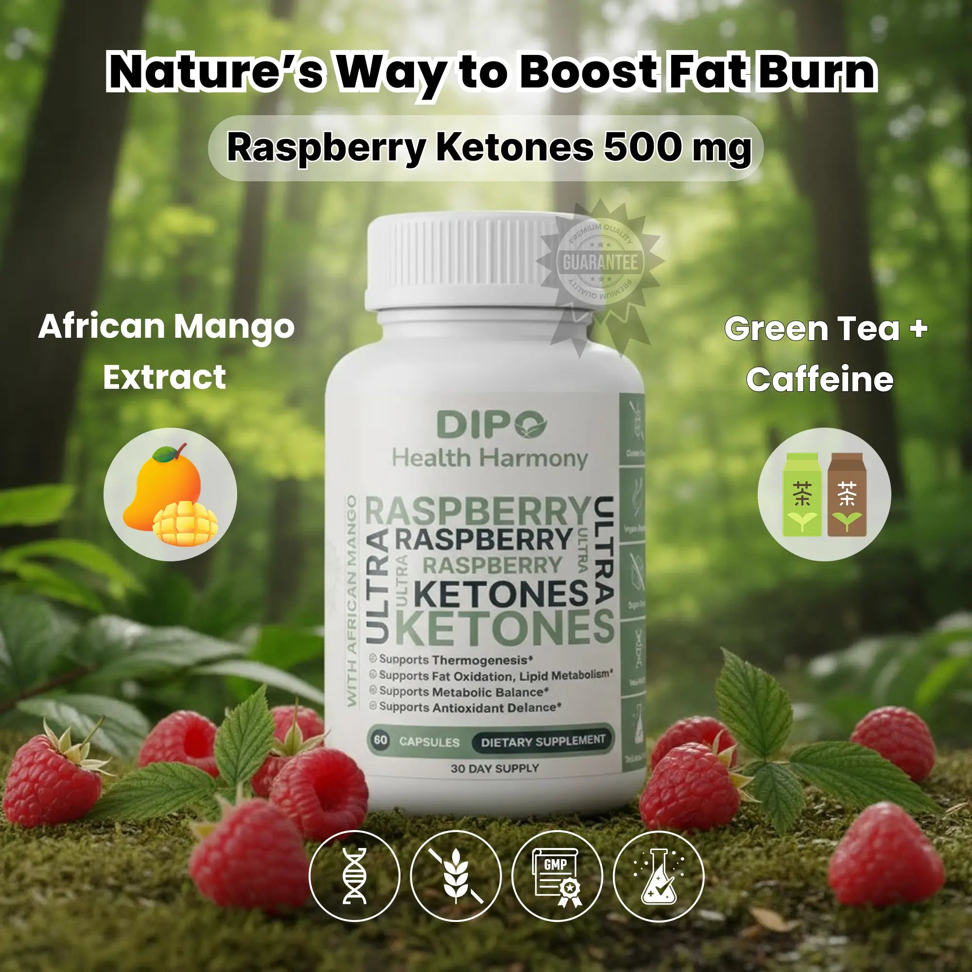 Raspberry Ketones and Green Tea work together to support the body's energy expenditure and fat oxidation processes.
