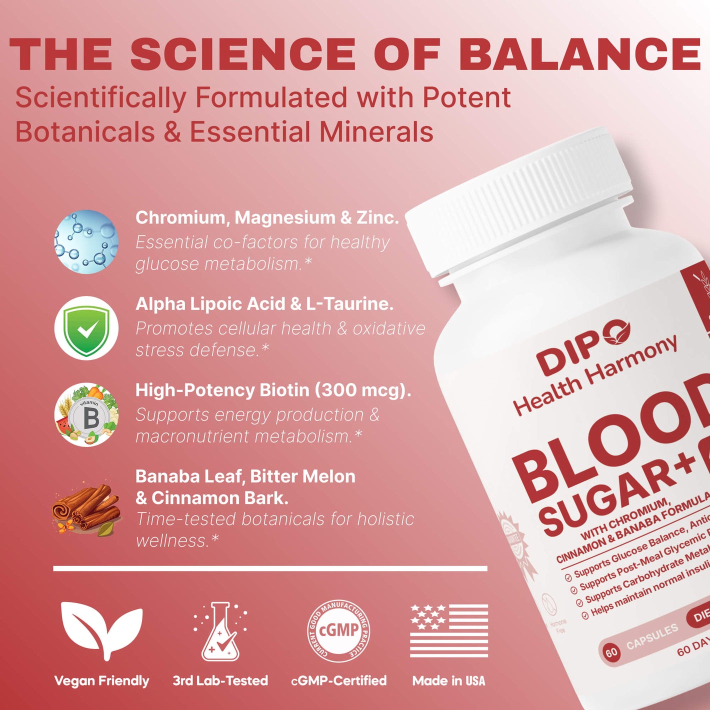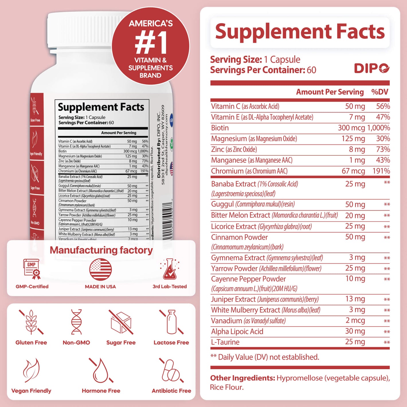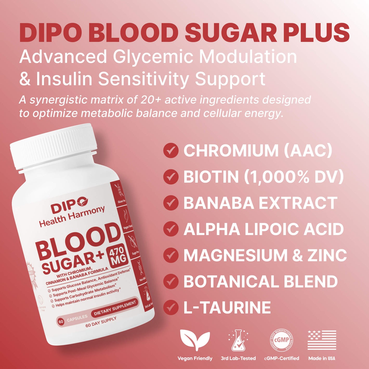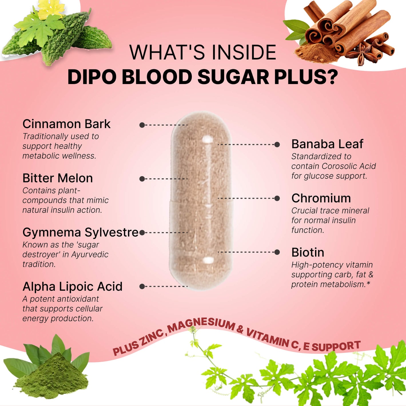 The main ingredients include Chromium, Magnesium, Zinc, Manganese, Biotin, Vitamin C, Vitamin E, Banaba leaf, Cinnamon, Bitter Melon, and Alpha-Lipoic Acid. These are supported by complementary botanicals such as Licorice, Yarrow, Juniper, Cayenne, and Guggul.