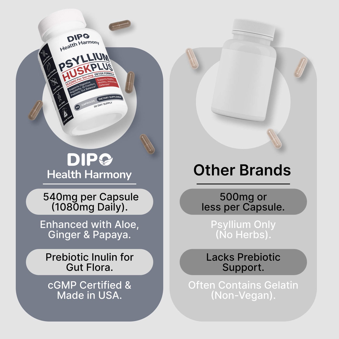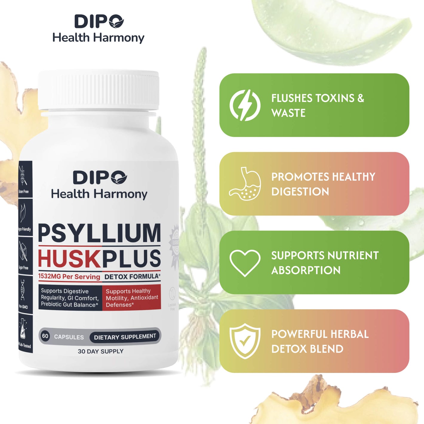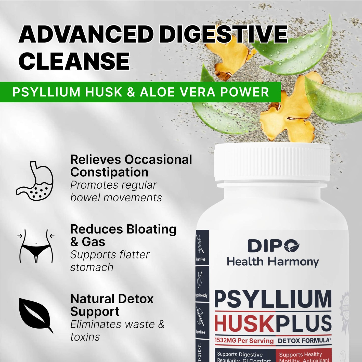 DIPO Psyllium Husk Plus – Advanced Fiber & Digestive Balance Formula with Aloe, Ginger, Chlorella & Prebiotic Inulin – Non-GMO, Vegan & Gluten-Free - 60 Capsules