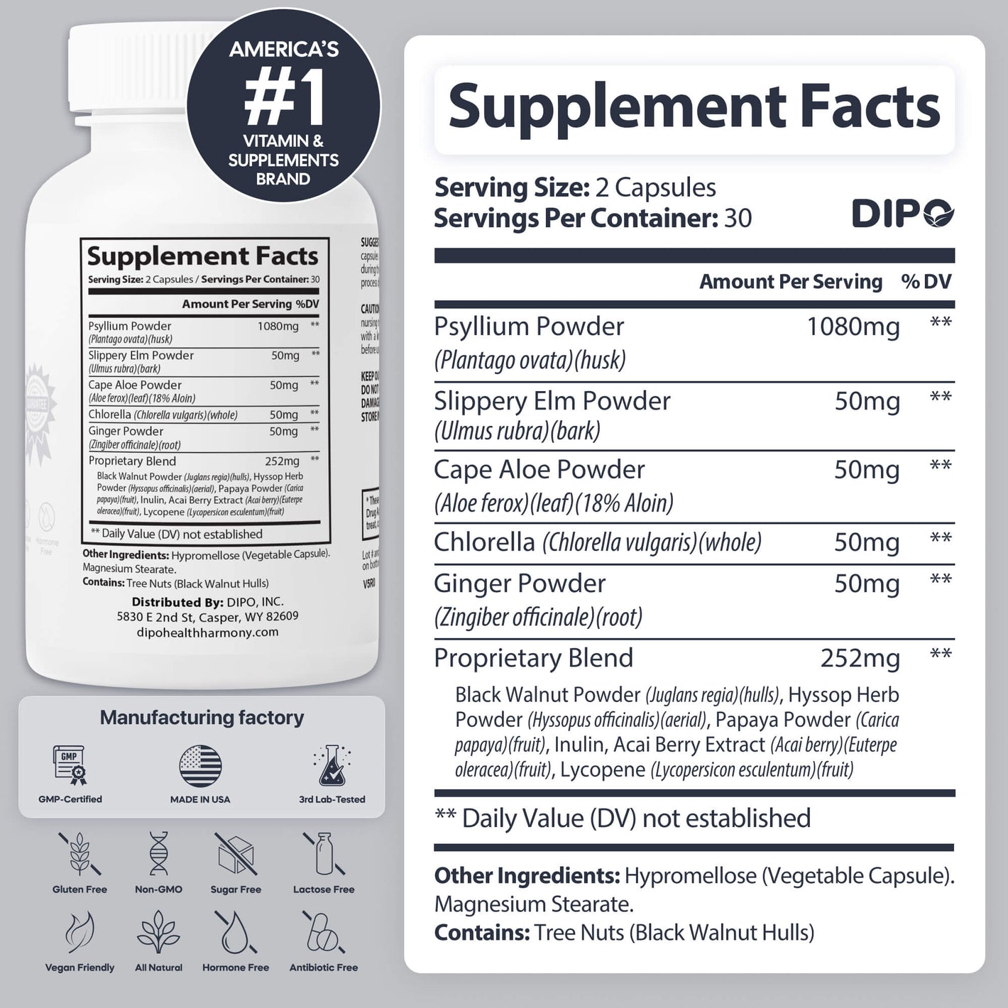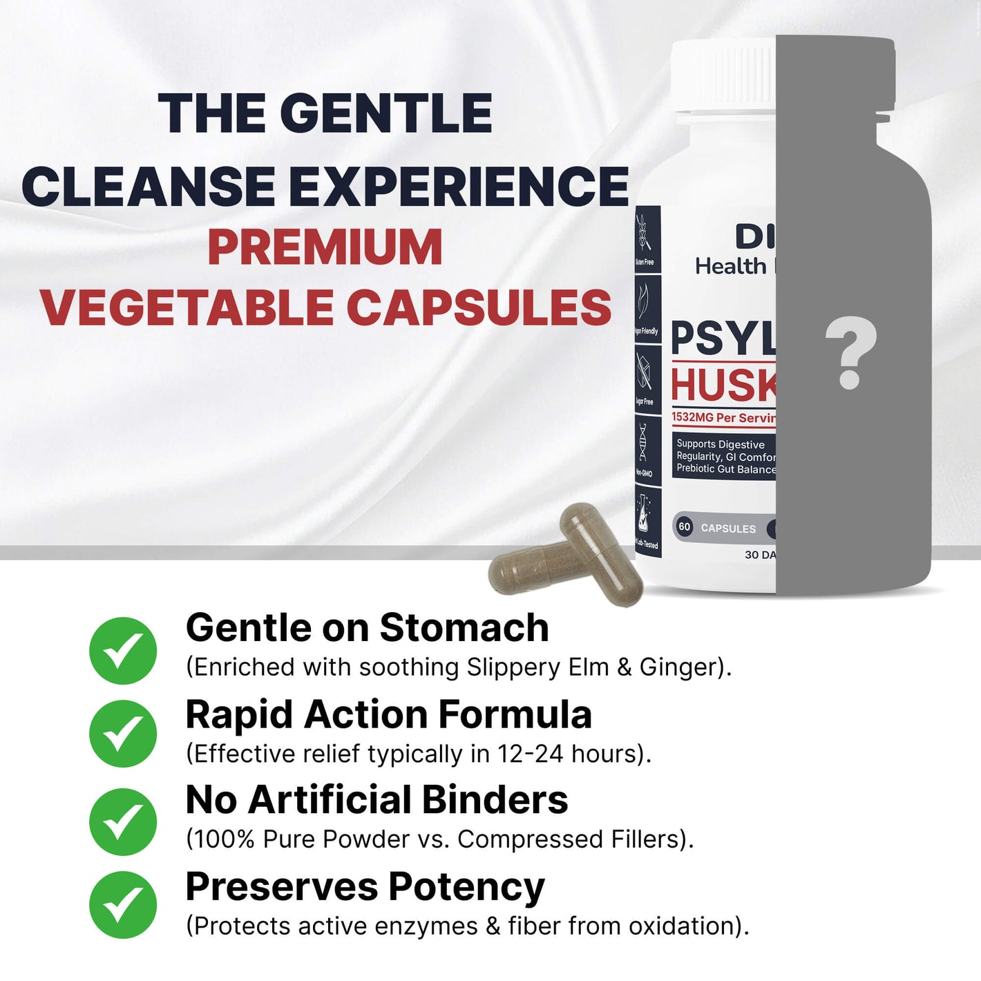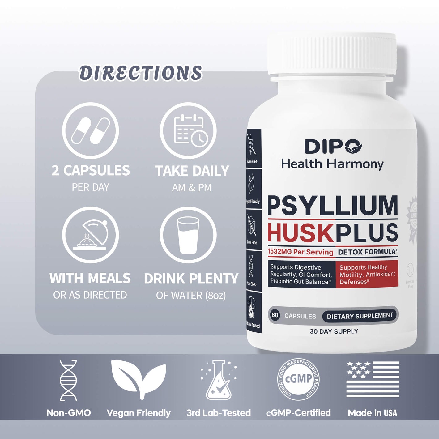 DIPO Psyllium Husk Plus – Advanced Fiber & Digestive Balance Formula with Aloe, Ginger, Chlorella & Prebiotic Inulin – Non-GMO, Vegan & Gluten-Free - 60 Capsules