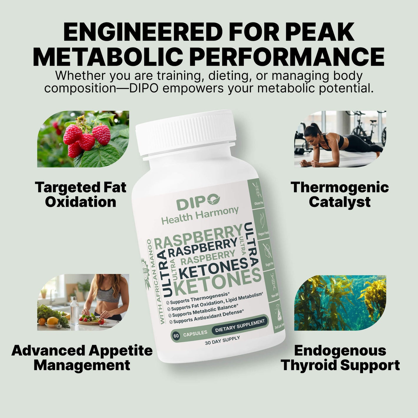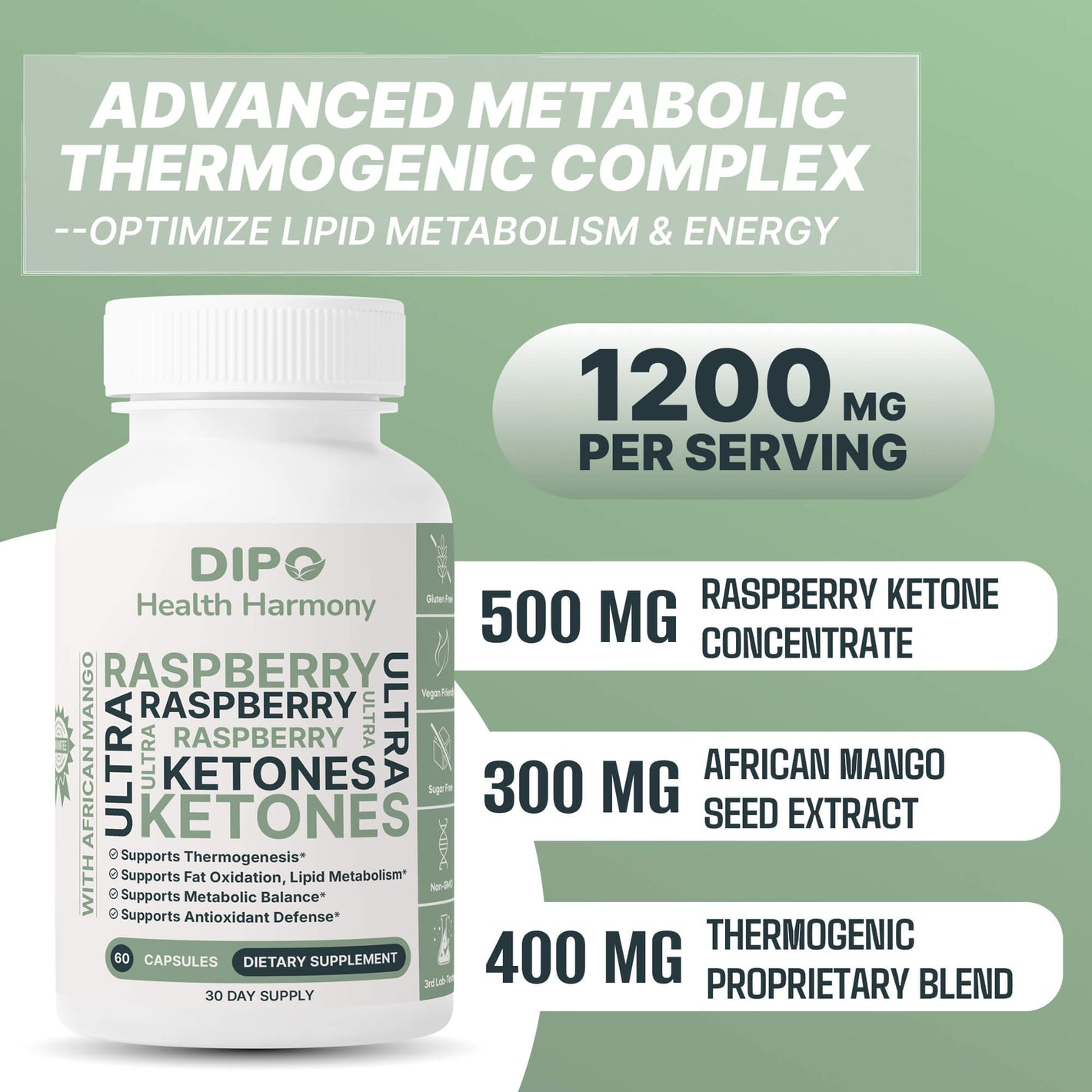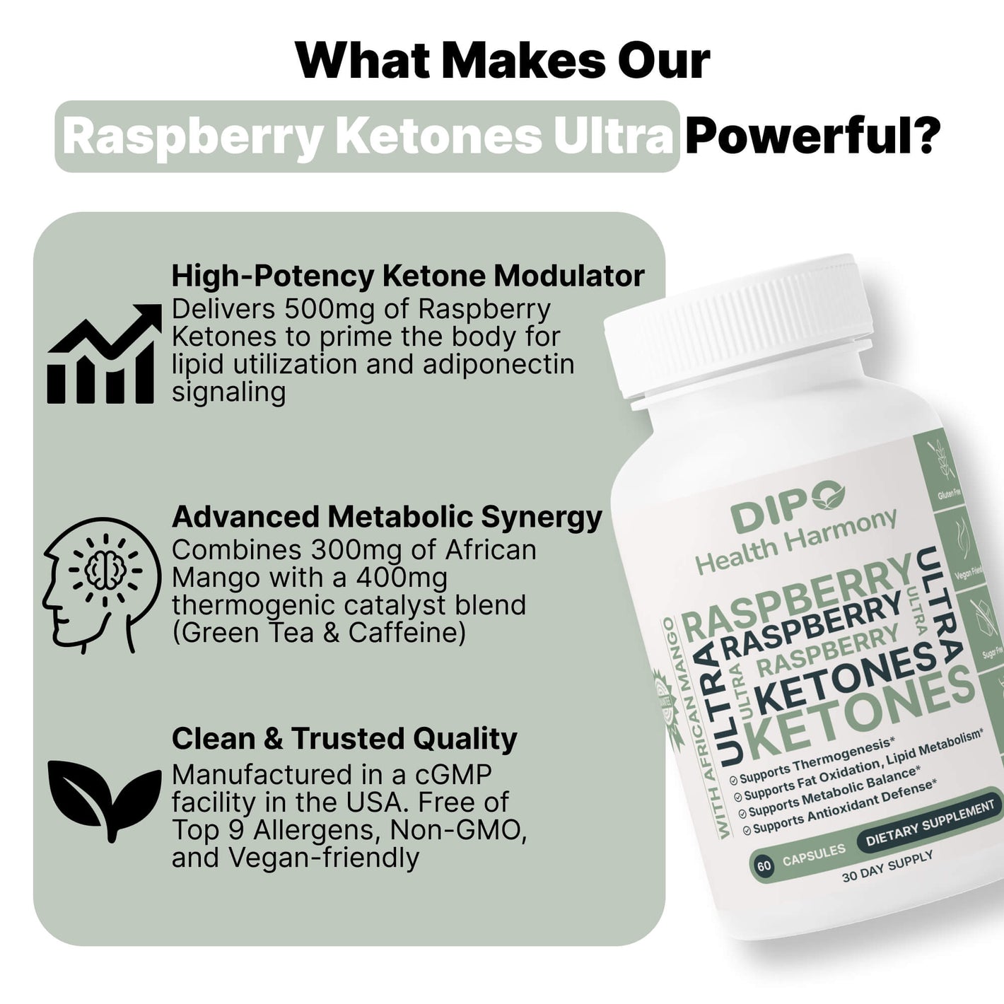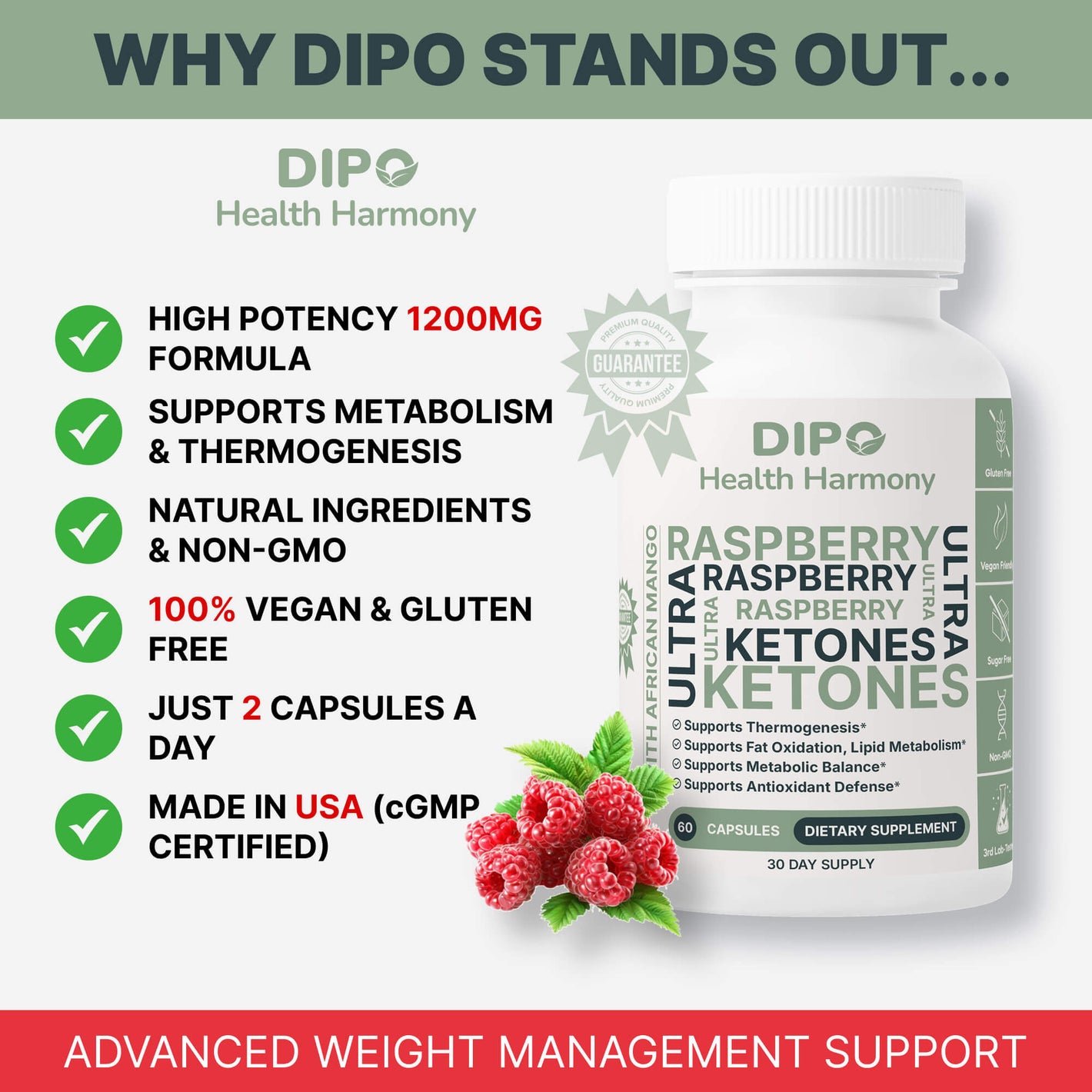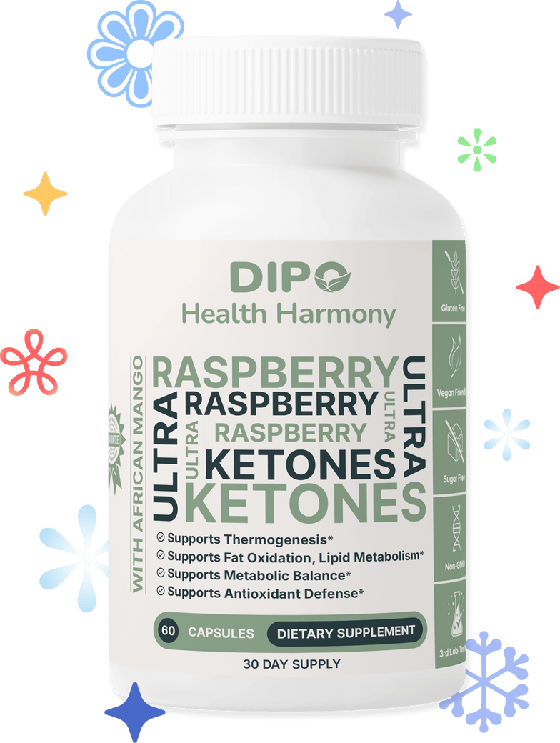 DIPO Raspberry Ketones Ultra with African Mango, Green Tea & Caffeine – Supports Metabolism, Energy & Appetite Control – Non-GMO, Gluten-Free, Lactose Free, Sugar-Free, Vegan, 60 Capsules