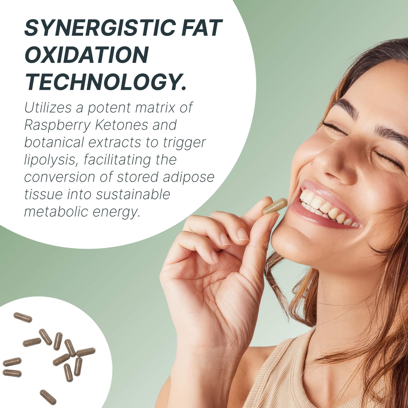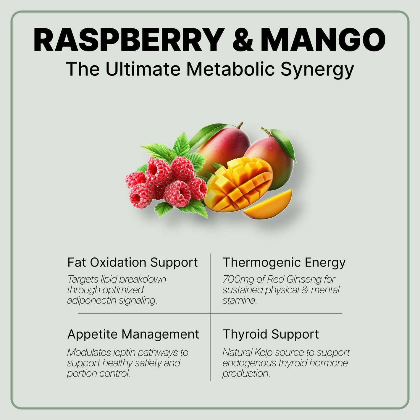 Raspberry Ketones and Green Tea work together to support the body's energy expenditure and fat oxidation processes.